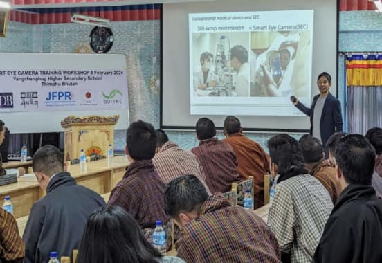 今回の訪問では、ブータン製のSmart Eye Cameraの生産について協議し、アジア開発銀行(ADB)の支援により、ブータン教育省に25セット納品しました。さらに、ブータン全域から選ばれた25名の教員を対象に、Smart Eye Cameraの使用方法に関するレクチャーとワークショップを実施しました。このワークショップを通じて、ブータン製Smart Eye Cameraを用いて、ヒルシュベルグ検査とスリットランプ撮影のプロトコルも習得することができました。