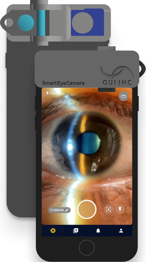 Smart Eye Camera (SEC) は現役眼科専門医が、日本及び開発途上国での眼科診療を通じて感じた問題点を解決するため、自ら発案して開発を行い、医療機器として実用化に成功した眼科医療機器です。SECはスマートフォンのアタッチメントであり、スマートフォンに取り付けることによって、既存の細隙灯顕微鏡と同様に眼瞼・角結膜・前房・虹彩・水晶体・硝子体の観察を行い、白内障などの眼科疾患を診断することができます。また、専用アプリケーションを用いた画像ファイリングシステムを用い、眼科の遠隔診療を可能としました。SECの開発によって、場所を選ばず、いつでも、だれでも眼科診察を行うことが可能となりました。世界の失明人口は4,400万人、30年後には3倍の1億2,000万人を越えると言われております。原因の半分以上は適切な診断と治療で視力を取り戻すことが可能な白内障であり、OUI Inc.はポータブルで高性能なSECを使って、失明のない世界を創ります。